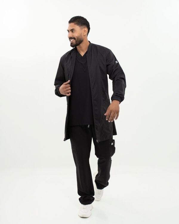 La chaqueta Alpha es una prenda larga y elegante que complementa tus scrubs con estilo.